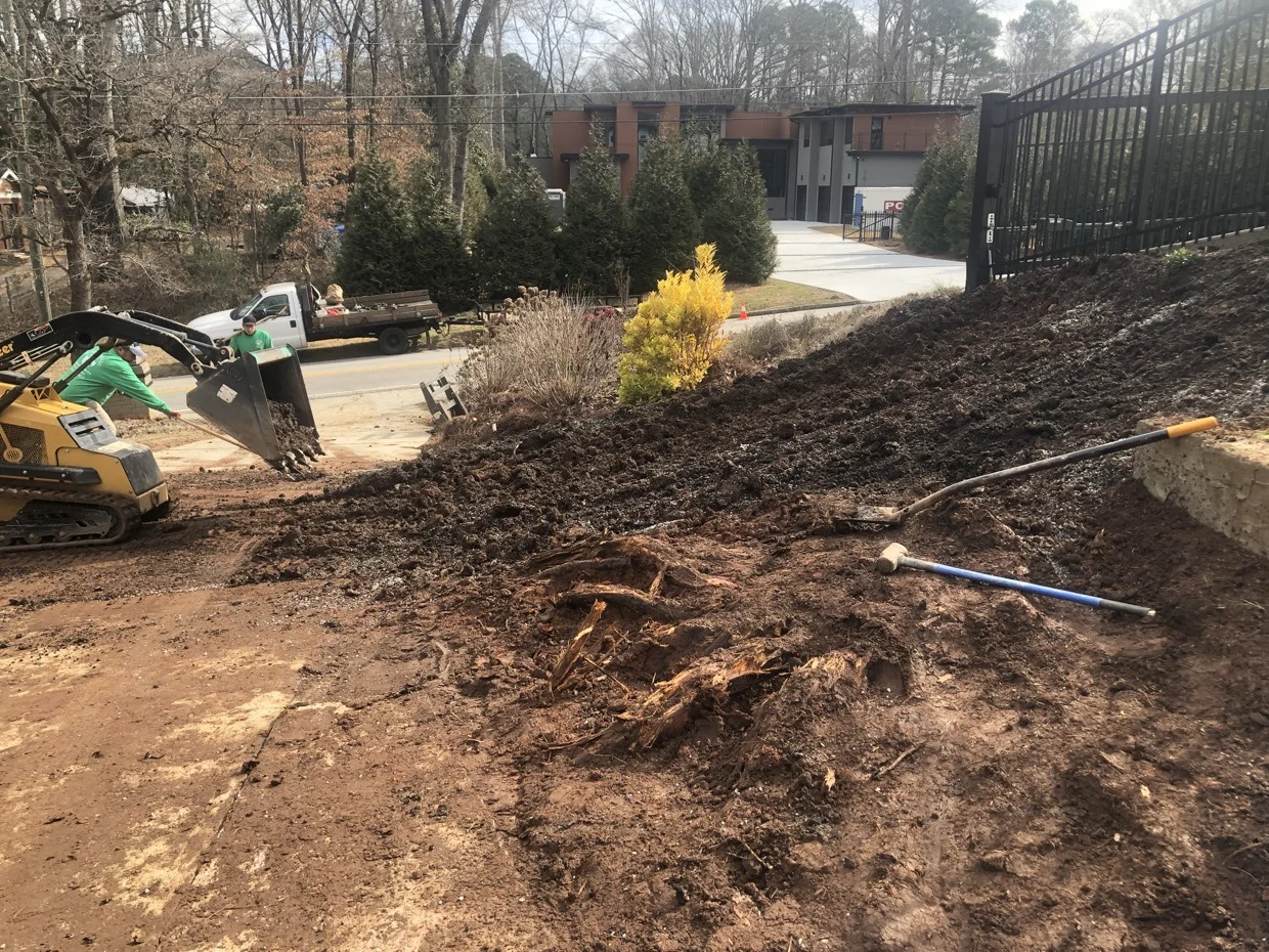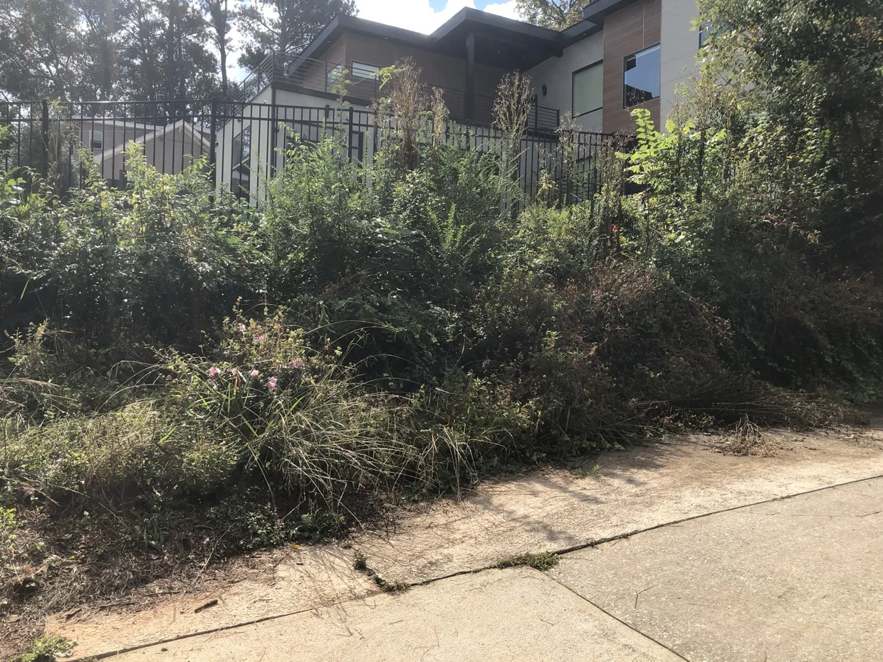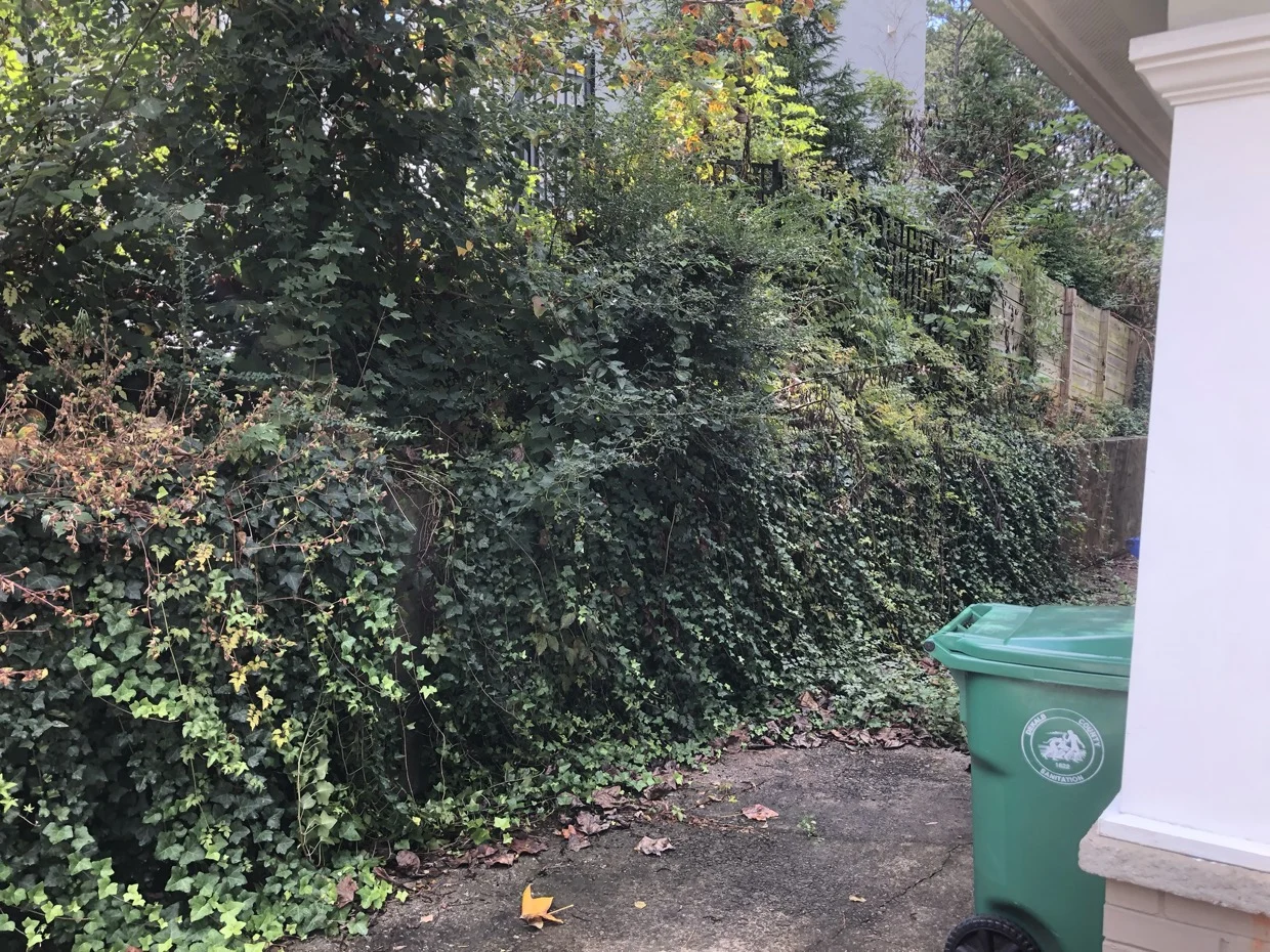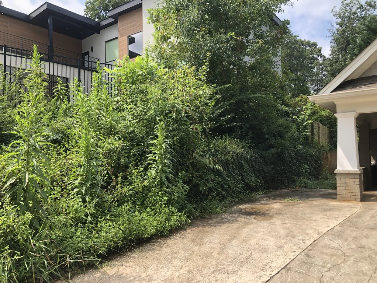 At this Frazier Road property, the homeowners were dealing with a long, densely overgrown hillside bordering their driveway. The slope stretched from the side of the house down to the street, cluttered with a tangle of invasive vines, shrubs, and old plastic landscaping fabric buried underneath. This overgrowth not only detracted from the curb appeal but also caused poor drainage issues that led to a mess and erosion along the driveway and sidewalk areas.