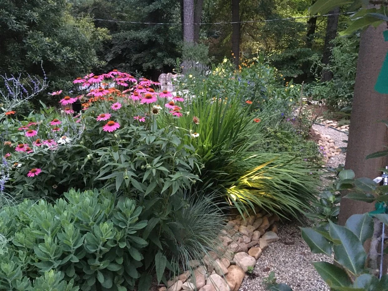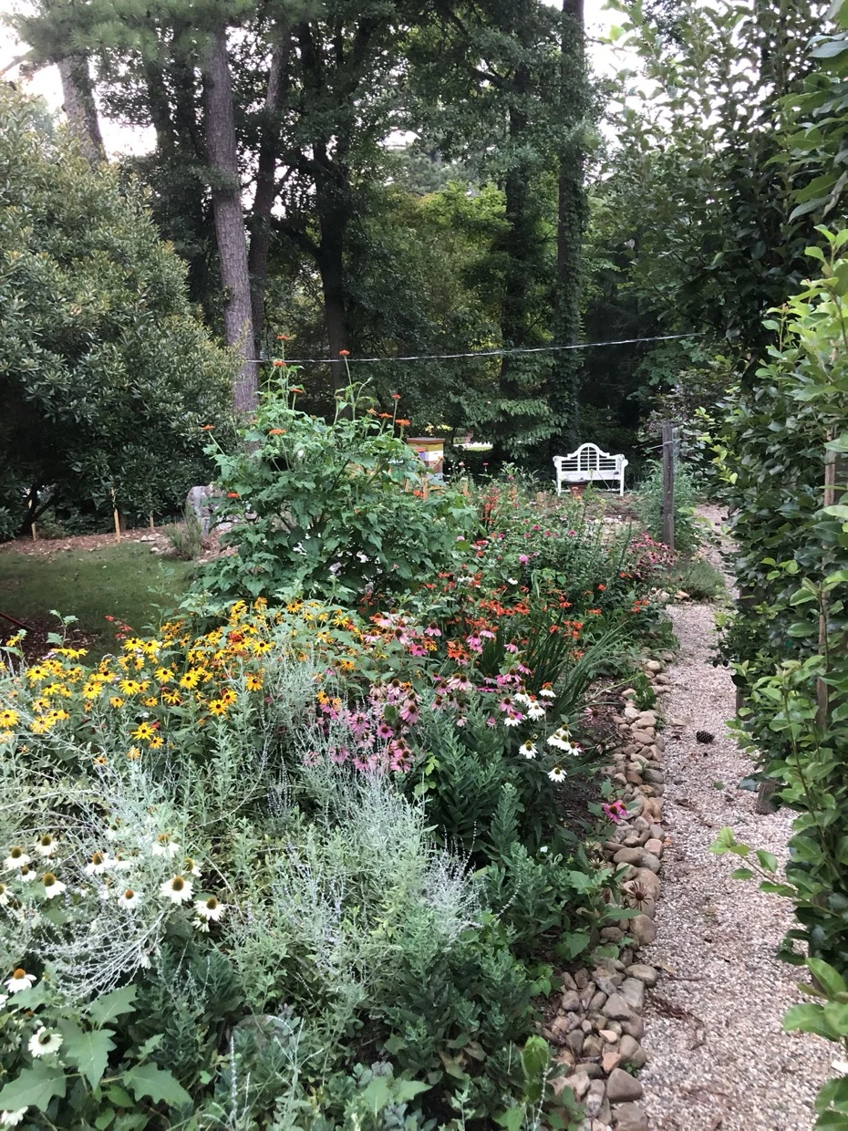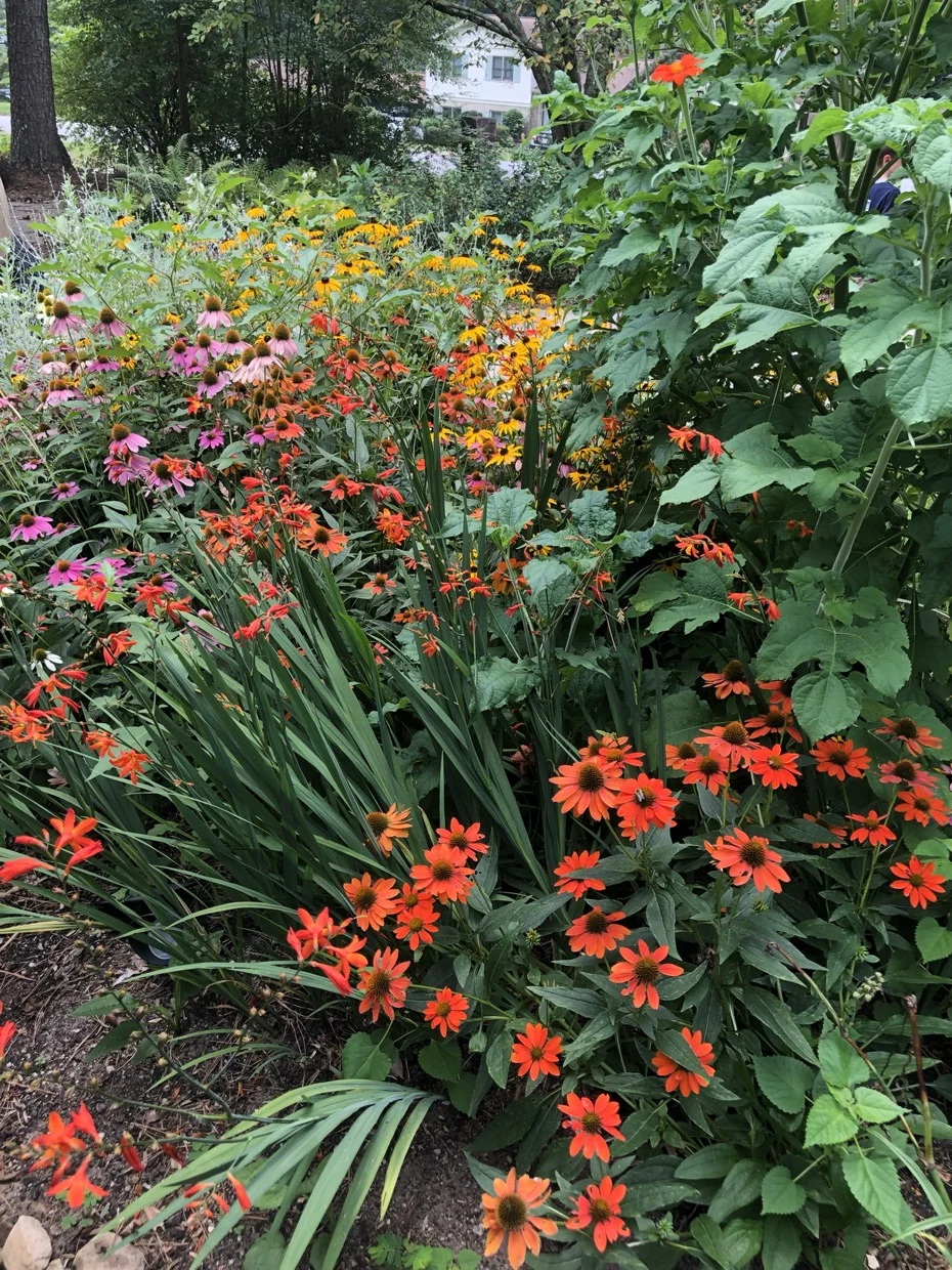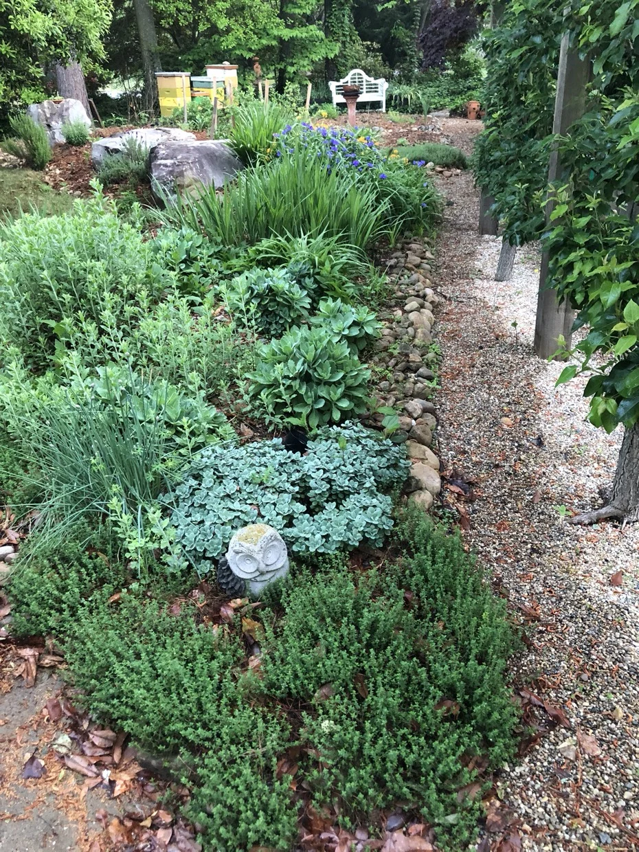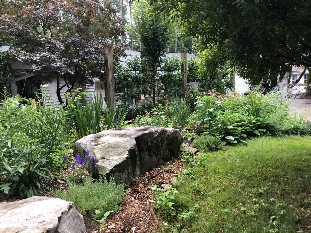 Our design strategy centered around block planting — grouping similar perennial plants and herbs together to simplify maintenance and create a cohesive look. The garden featured a mix of pollinator-attracting ornamentals and edible herbs planted in clusters throughout the yard.
