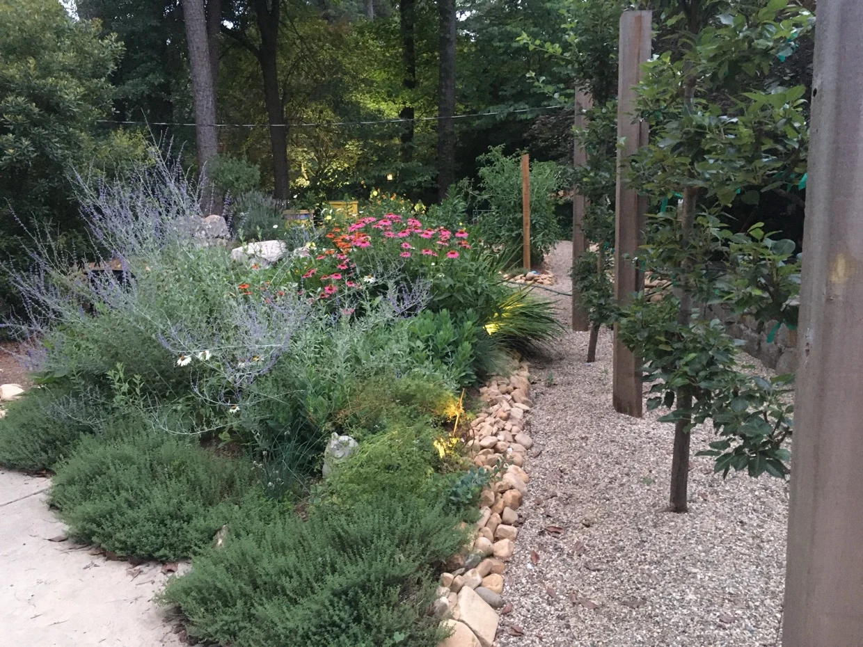 The espaliered fruit trees not only provide privacy screening from the road and courtyard but also produce delicious fruit in late summer and fall. Their spring blooms add seasonal beauty and attract pollinators, enhancing the garden’s health and productivity.